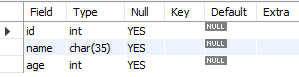 CREATE TABLE users (id INT, name CHAR(4), age INT);