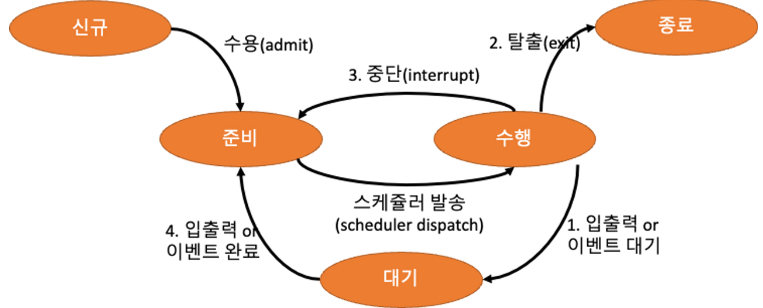 - ์ ๊ท ํ๋ก์ธ์ค๊ฐ ์์ฉ/ ๋๊ธฐ ํ๋ก์ธ์ค์ ์ ์ถ๋ ฅ,์ด๋ฒคํธ๊ฐ ์๋ฃ/ ์ํ ํ๋ก์ธ์ค์ ์ค๋จ
