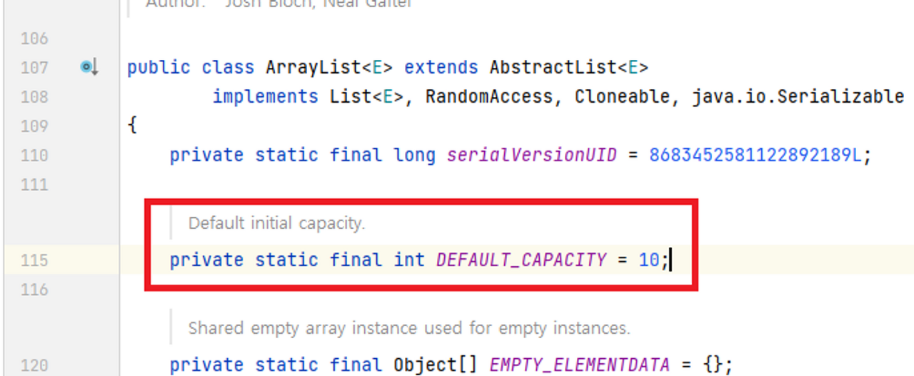 ArrayLIst์ ๊ธฐ๋ณธ ํฌ๊ธฐ ์ค์ : 10๊ฐ