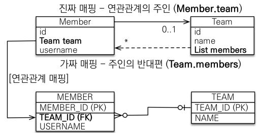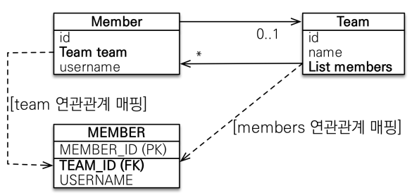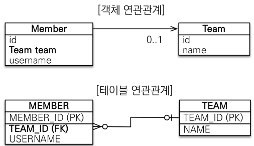 ** ๊ฐ์ฒด์งํฅ ํ๋ก๊ทธ๋๋ฐ : ๊ฐ์ฒด ๊ฐ ์ฐ๊ด๊ด๊ณ๋ฅผ ์ค์ ํ ๊ฒ -> Member ์ํฐํฐ ์์์ Team ์ํฐํฐ๋ฅผ ์ฐธ์กฐํ๋ ๊ฐ์ฒด team๊ณผ DB์ Member ํ ์ด๋ธ์ FK์ธ Team_ID๋ฅผ ๋งคํํ์ฌ PK๋ฅผ ํตํด Team ๊ฐ์ ์ ๊ทผ ๋ฐ ์์ ์ ์ํํ ์ ์๋ค.
